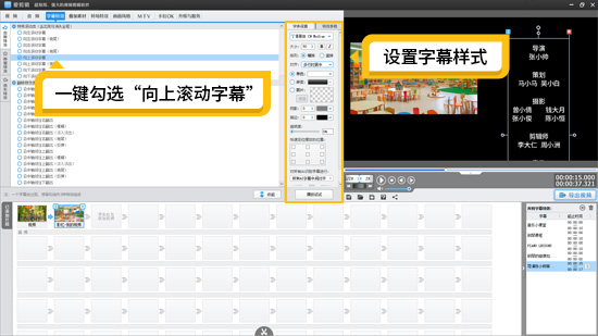 在“字幕特效”选项卡中,双击视频预览框输入老师、学生的名字。设置字幕颜色为白色、字体为50、对齐方式为“多行时居中”。勾选“向上滚动字幕”特效,并设置特效时长为10秒。
